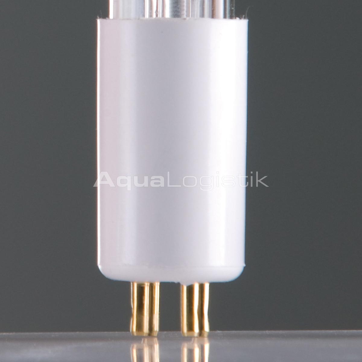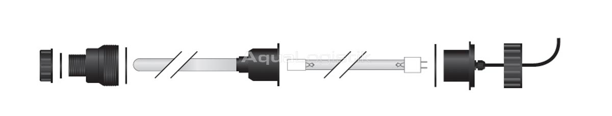 Im Lieferumfang ist ausschließlich das Ersatzleuchtmittel enthalten. Das Detailbild zeigt die kompletten Komponenten der UV-C (Elektrischer Sockel, UV-C-Ersatzleuchtmittel, Quarzglas und Behälterverschraubung)